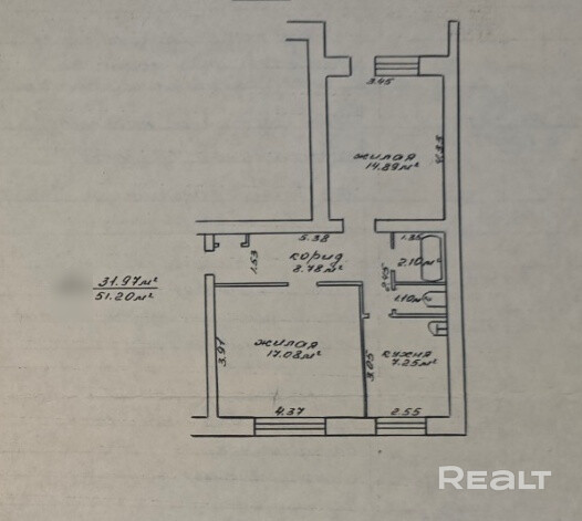 Площадь: общая 51,2 м2 / жилая 31,97 м2 / кухня 7,25 м2.