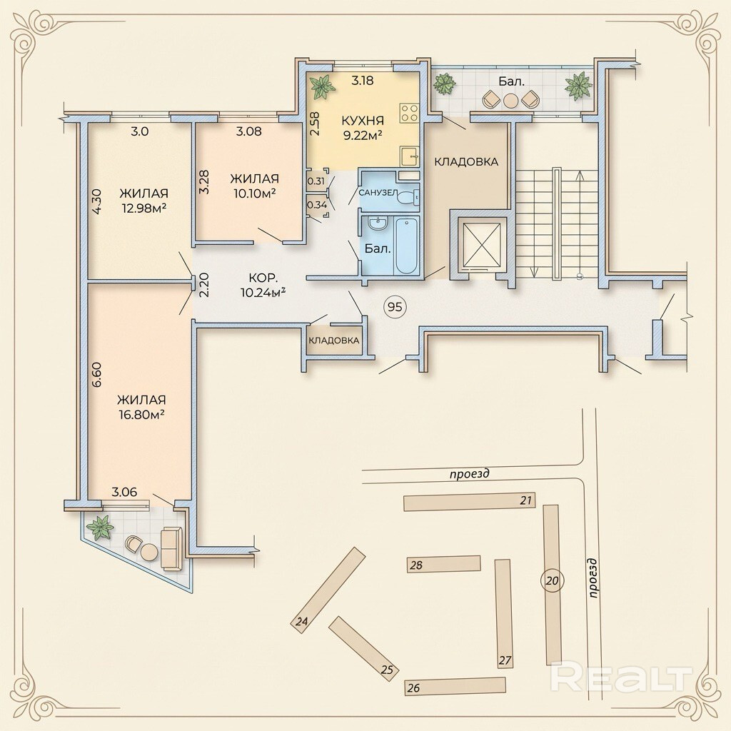 Площадь: Общая 65.5 м2 | Жилая 39.88 м2 | Кухня 8.22 м2.
