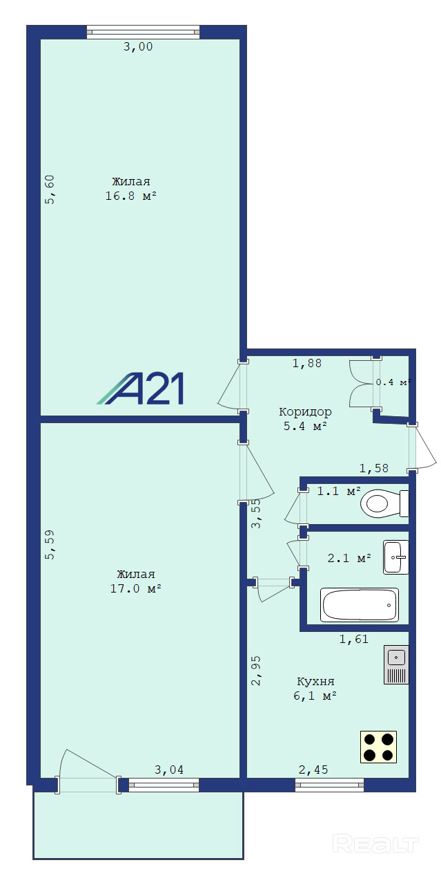 Общая площадь 48.9 кв. м., жилая 33.8 кв. м., кухня 6.1 кв. м.. Квартира требует финансовых вложений.
