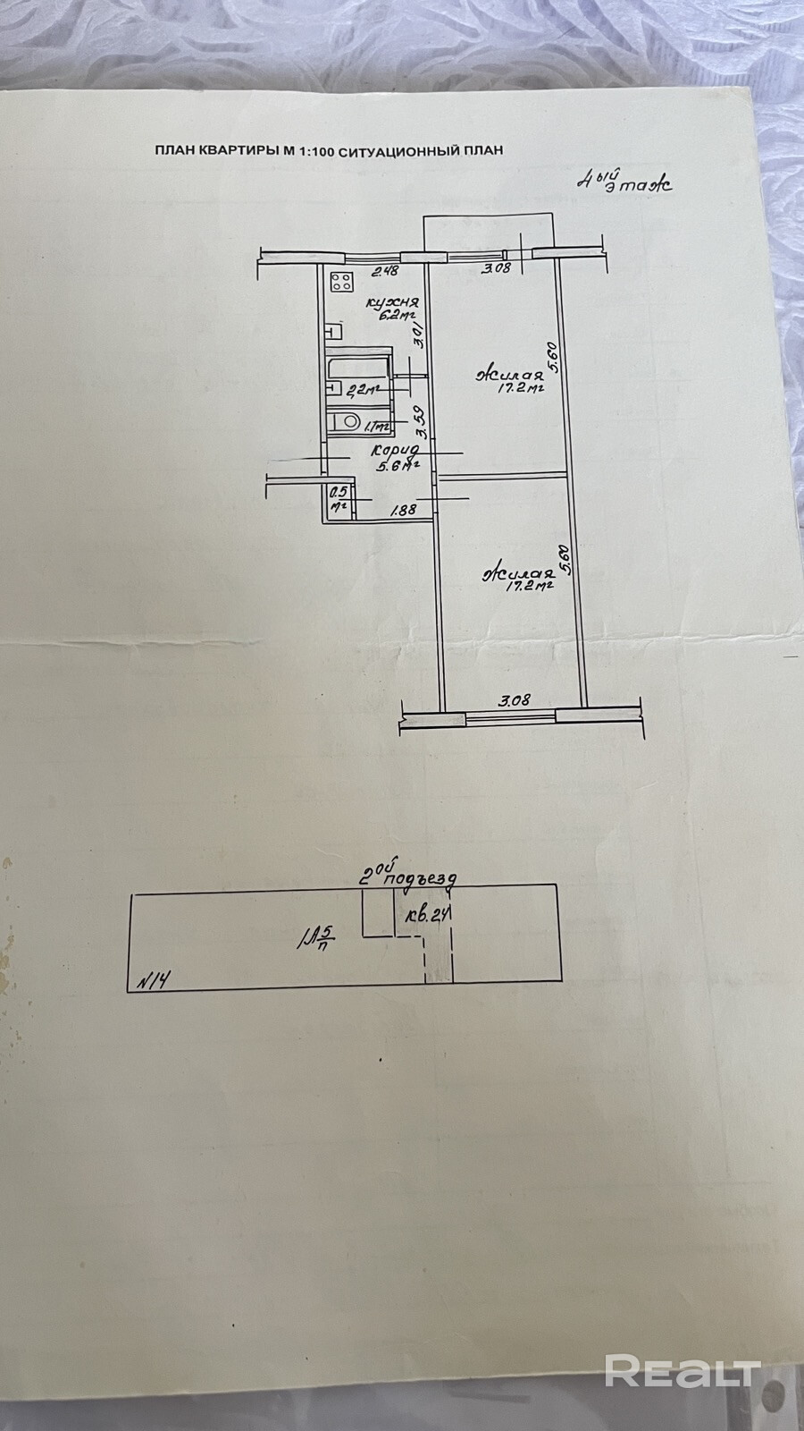 • Общая площадь: 50 м2, жилая — 34,4 м2, кухня — 6,2 м2.