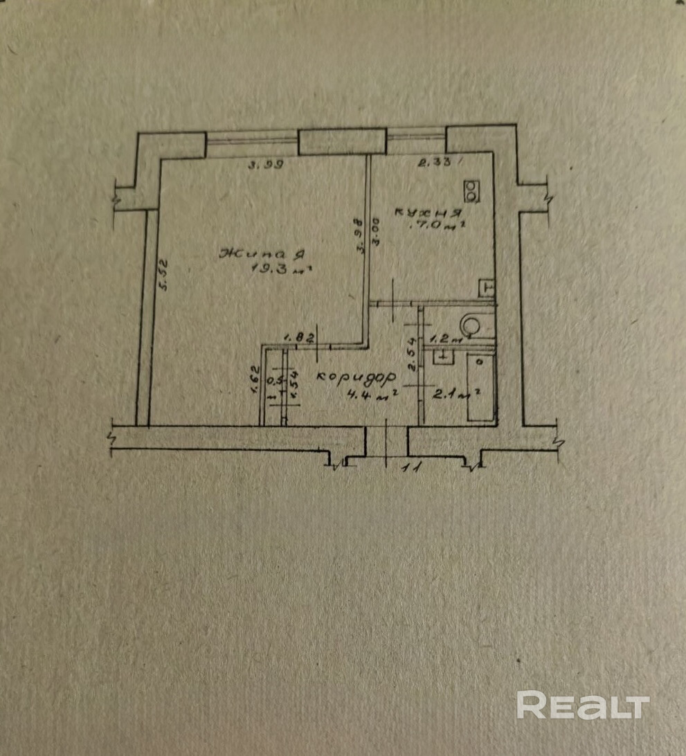 • Площадь: общая — 34.5 м2, жилая — 19.3 м2, кухня — 7 м2.