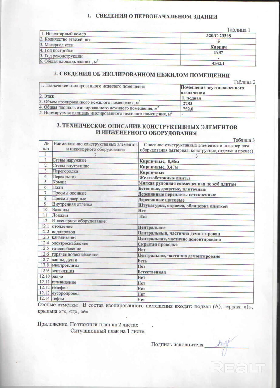 Площадь: 752 м2 (включая основные помещения 1-го этажа и подвал).