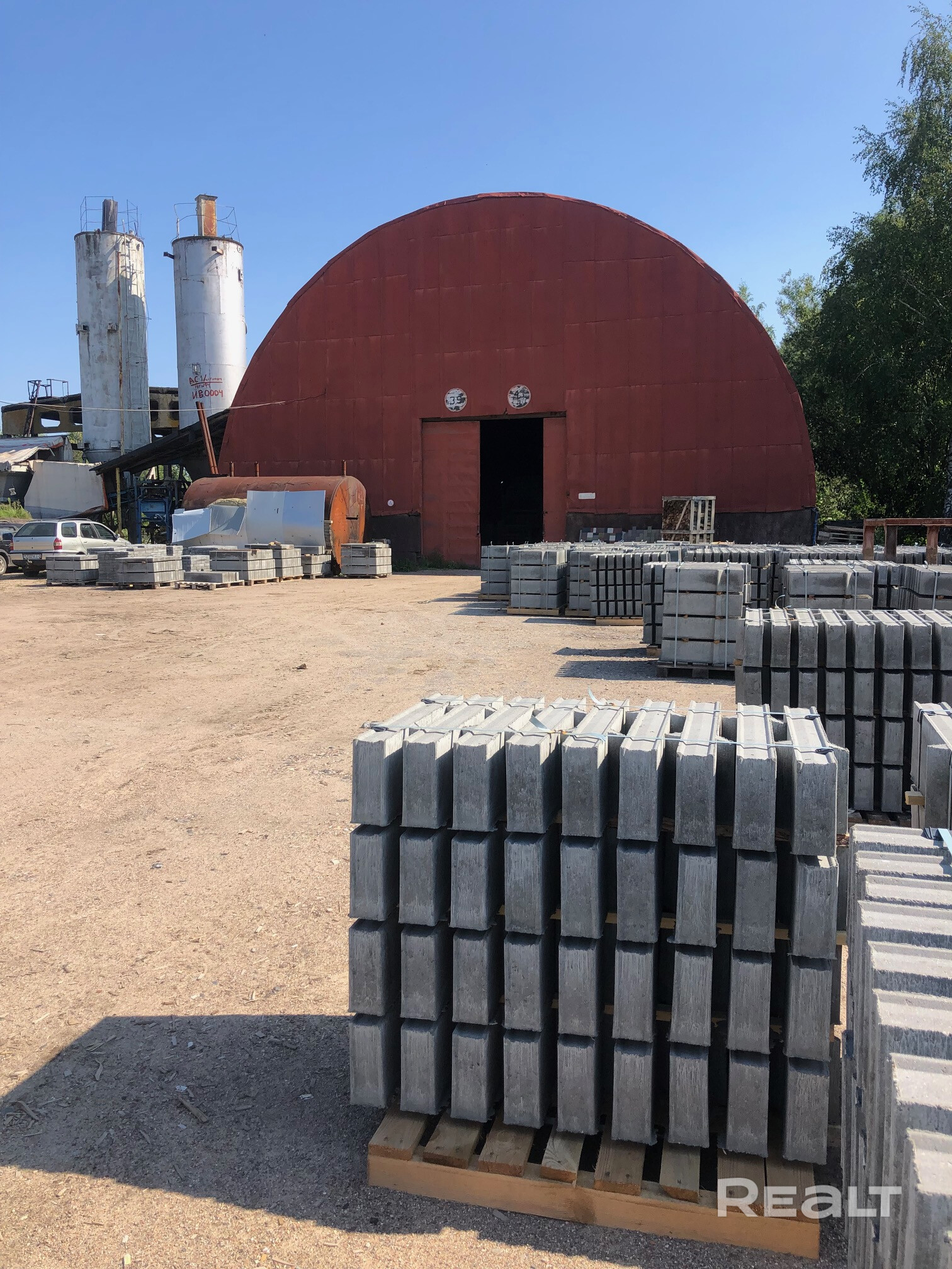Производсвенная база . Металлический арочный ангар 646,6м2. Навес 356,4м2 .Трансформаторная подстанция КТ-100. Земельный участок 4,21 га. Скважина. Рядом железная дорога. Цена за все 120000 бел. рублей.