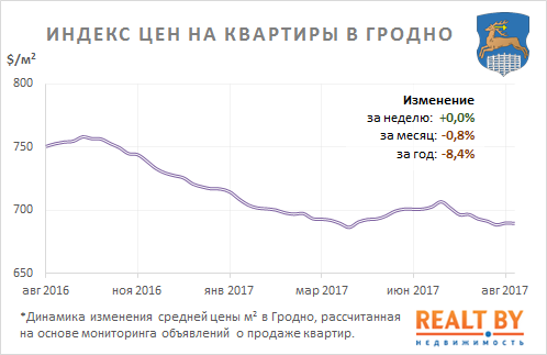 Средняя цена предложения в объявлениях о продаже квартир в Гродно на минувшей неделе не изменилась и составила 690 $/м2.