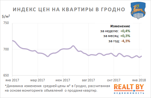 Средняя цена предложения в объявлениях о продаже квартир в Гродно на минувшей неделе выросла на 0,4% и составила 688 $/м2.