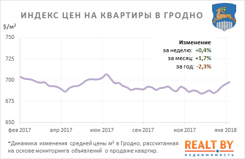 Средняя цена предложения в объявлениях о продаже квартир в Гродно на минувшей неделе выросла на 0,4% и составила 698 $/м2.