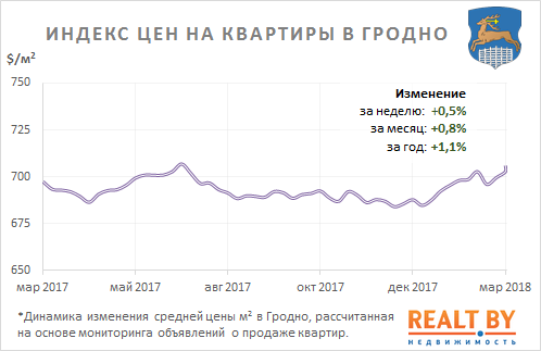 Средняя цена предложения в объявлениях о продаже квартир в Гродно на минувшей неделе выросла на 0,5% и составила 706 $/м2.