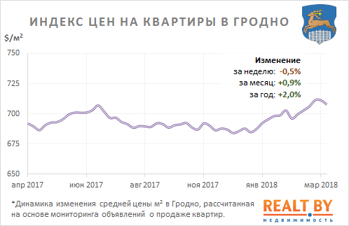 Мониторинг цен предложения квартир в Гродно за 26 марта — 2 апреля 2018 годаЗа неделю с 26 марта по 2 апреля информационно-аналитическим центром Realt.by были отмечены следующие изменения на первичном и вторичном рынках недвижимости города Гродно: