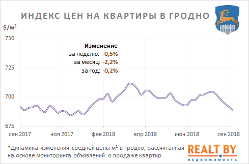 Средняя цена предложения в объявлениях о продаже квартир в Гродно на минувшей неделе снизилась на 0,5% и составила 688 $/м2.
