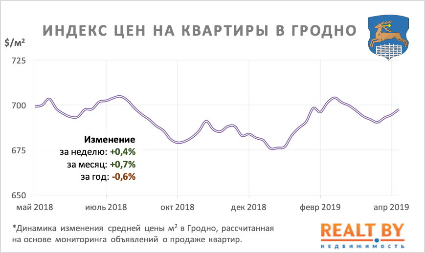 Средняя цена предложения в объявлениях о продаже квартир в Гродно на минувшей неделе выросла на 0,4% и составила 698 $/м2.