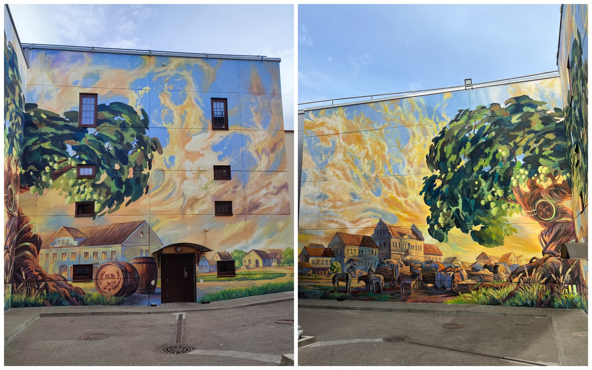 Стену Музея Лидского бровара превращали в новый арт-объект мастера Евгений Сосюра и Сергей Рысаков. Эскиз граффити создала выпускница БГАИ Александра Прима.