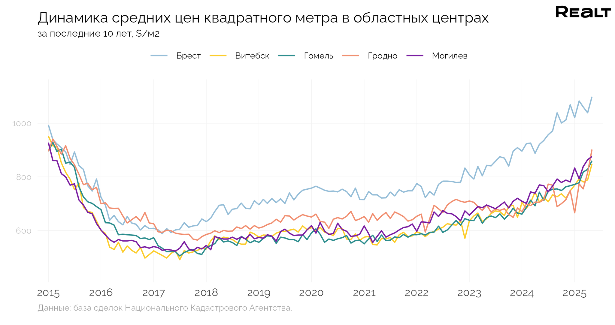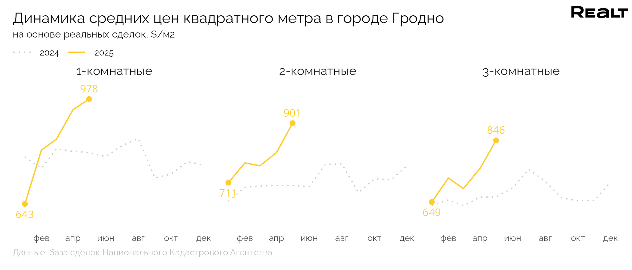 По данным сделок средняя цена квадратного метра 1-комнатных квартир, которые на данный момент продаются в среднем по 978 $/м2, увеличилась на 3.6%. Средняя стоимость 2-комнатных квартир в Гродно составляет 901 $/м2 (+11.6% за месяц). 3-комнатные квартиры продавали в среднем за 846 $/м2 (+11.9% за месяц). Но тут стоит отметить, что такой рост цен на двушки и трешки мог произойти буквально за счет нескольких дорогих сделок. Ведь когда сделок немного, то даже одна дорогая квартира может существенно потянуть средний ценник вверх.