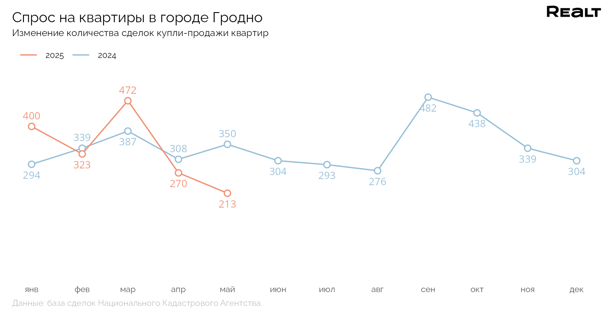 Медиана цены покупки/продажи квартир в Гродно за май: