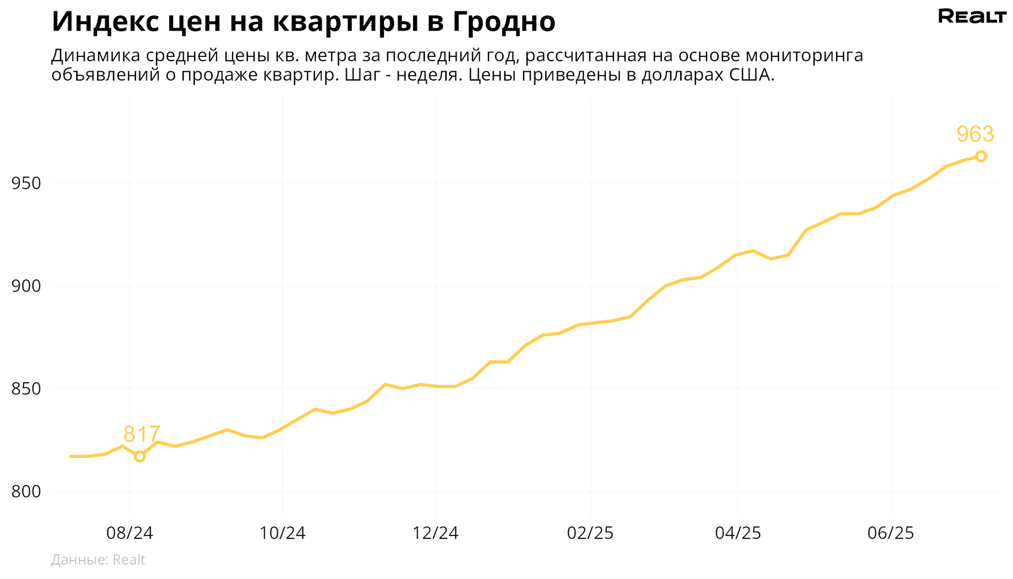 За неделю, c 30 июня по 7 июля 2025 года, средняя цена в объявлениях о продаже квартир в Гродно выросла на 0.2% и составила 963 $/м2. При этом количество квартир в продаже увеличилось на 3.4%. Что еще произошло на рынке жилья крупнейших городов Гродненской области за семь дней — в материале.