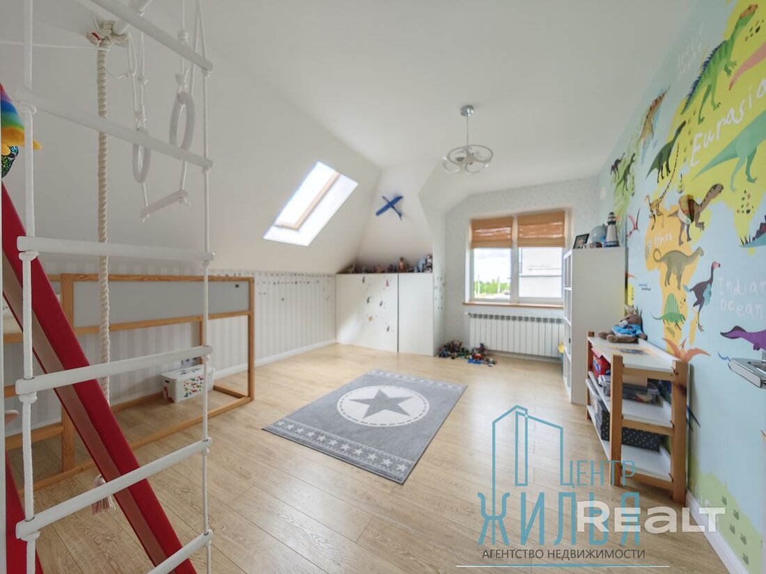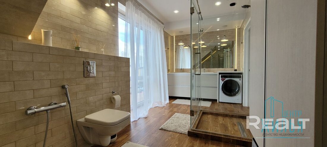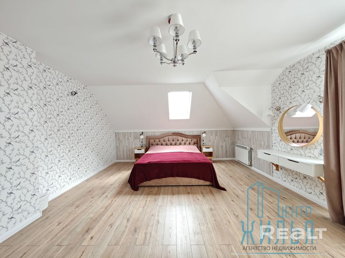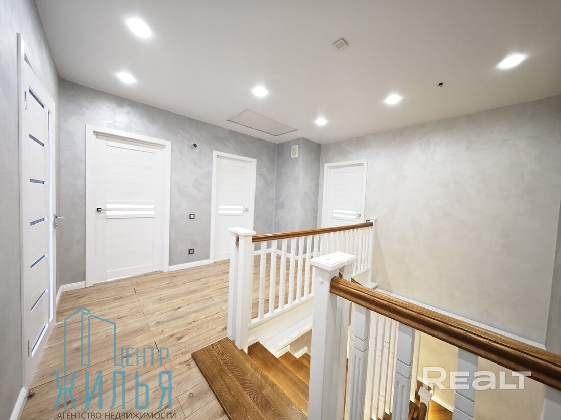 На втором этаже расположены жилые комнаты с мансардными и панорамными окнами, включая мастер-спальню (27 м2) с балконом, собственной гардеробной и просторным санузлом (14 м2). Санузел оборудован гидромассажной ванной, душевой кабиной, инсталляцией, тумбой с двумя чашами и выходом на другой балкон. Также на этаже находятся детская комната и две дополнительные спальни.