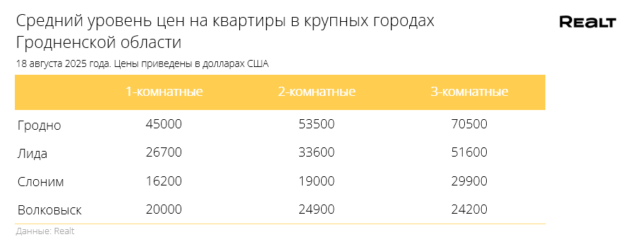 За неделю, с 11 по 18 августа 2025 года, средняя цена в объявлениях о продаже квартир в Гродно выросла на 0.3% и составила 1000 $/м2. При этом количество квартир в продаже уменьшилось на 1.7%. Что еще произошло на рынке жилья крупнейших городов Гродненской области за семь дней — в материале.