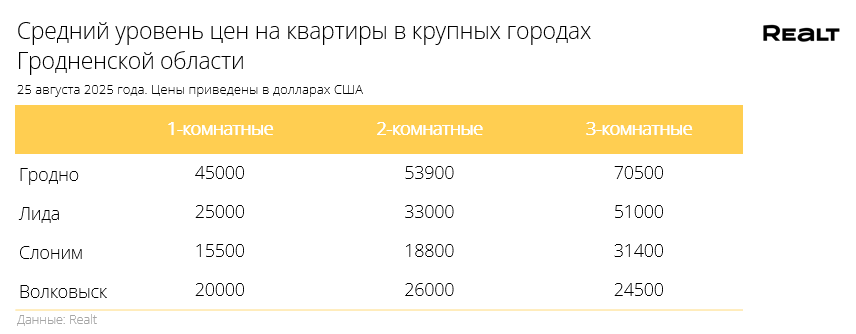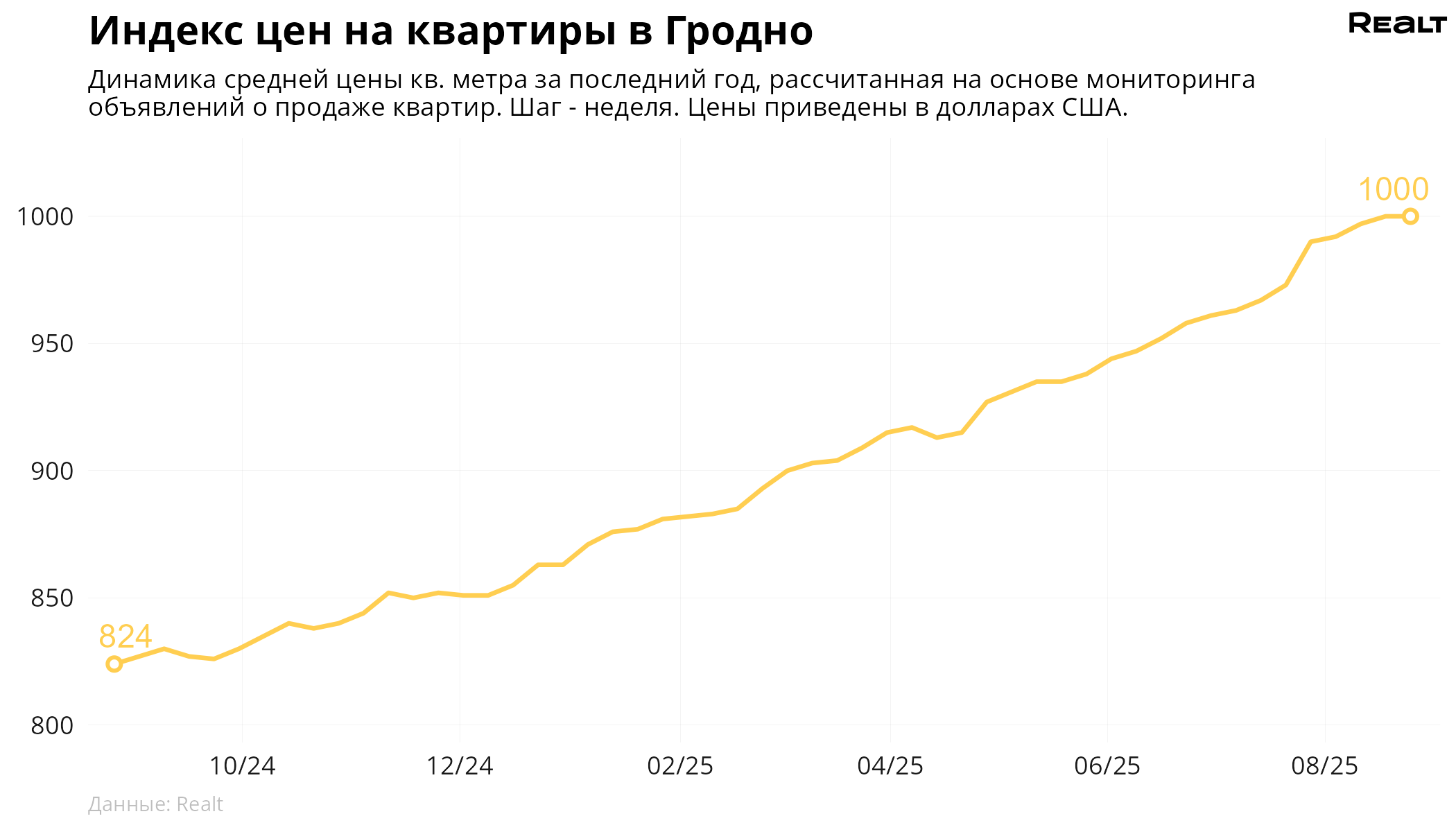 За неделю, с 18 по 25 августа 2025 года, средняя цена в объявлениях о продаже квартир в Гродно не изменилась и составила 1000 $/м2. При этом количество квартир в продаже уменьшилось на 0.2%. Что еще произошло на рынке жилья крупнейших городов Гродненской области за семь дней — в материале.