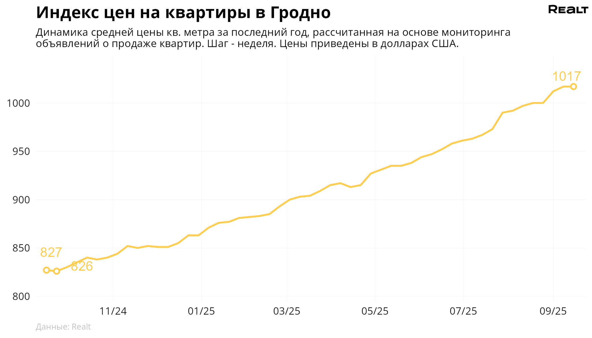 За неделю, с 8 по 15 сентября 2025 года, средняя цена в объявлениях о продаже квартир в Гродно не изменилась и составила 1017 $/м2. При этом количество квартир в продаже увеличилось на 0.5%. Что еще произошло на рынке жилья крупнейших городов Гродненской области за семь дней — в материале.
