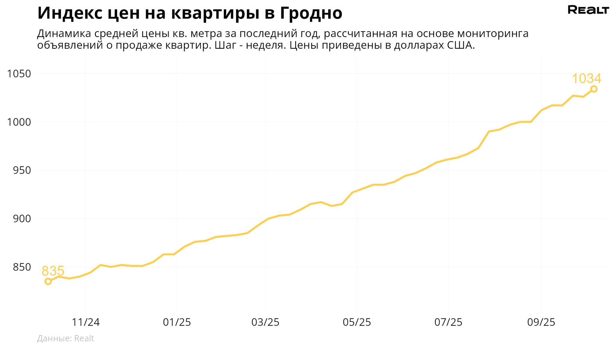 За неделю, c 29 сентября по 6 октября 2025 года, средняя цена в объявлениях о продаже квартир в Гродно выросла на 0.8% и составила 1034 $/м2. При этом количество квартир в продаже увеличилось на 0.4%. Что еще произошло на рынке жилья крупнейших городов Гродненской области за семь дней — в материале.
