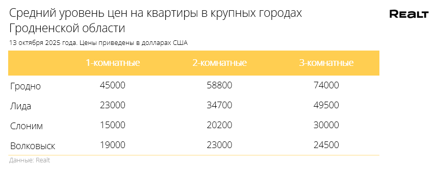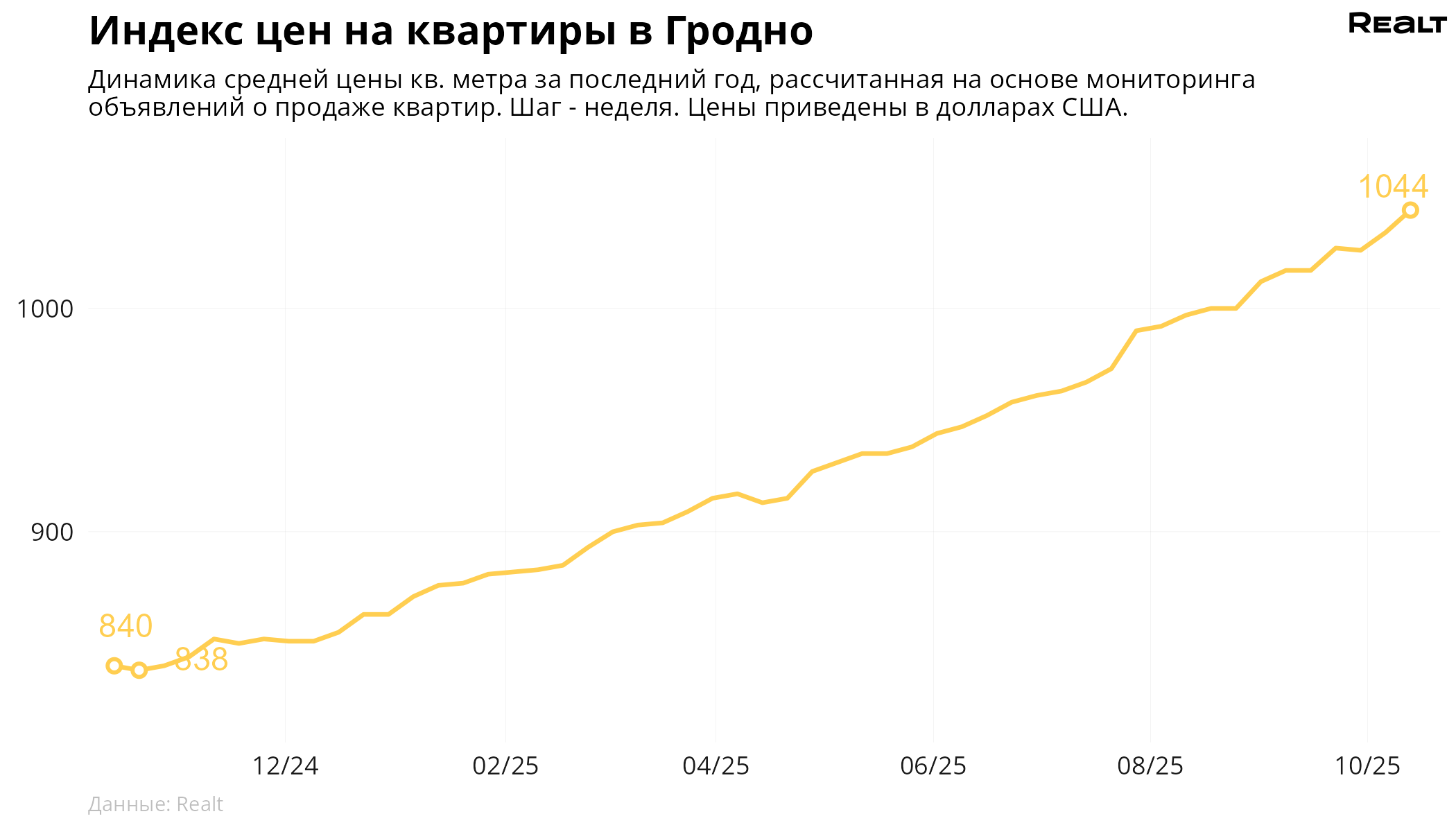За неделю, с 6 по 13 октября 2025 года, средняя цена в объявлениях о продаже квартир в Гродно выросла на 1% и составила 1044 $/м2. При этом количество квартир в продаже уменьшилось на 3.6%. Что еще произошло на рынке жилья крупнейших городов Гродненской области за семь дней — в материале.