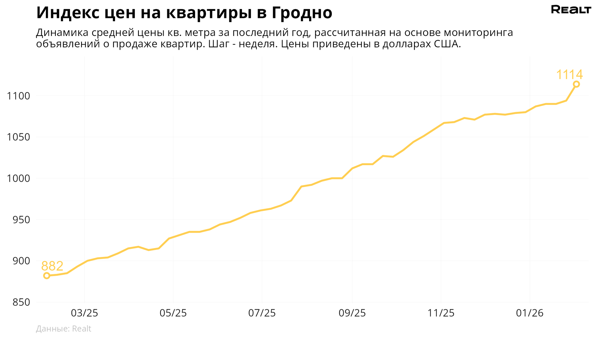За неделю, c 26 января по 2 февраля 2026 года, средняя цена в объявлениях о продаже квартир в Гродно выросла на 1.8% и составила 1114 $/м2. При этом количество квартир в продаже увеличилось на 0.8%. Что еще произошло на рынке жилья крупнейших городов Гродненской области за семь дней — в материале.