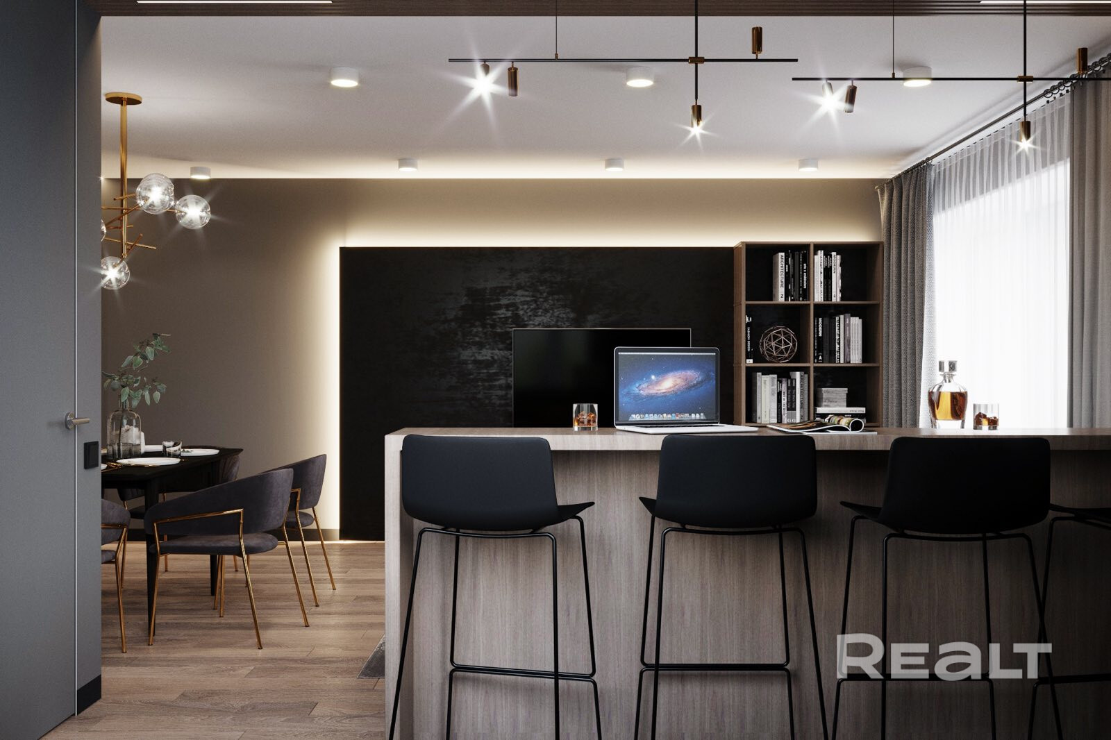 Все пространства выдержаны в едином стиле. В гостиной стоит большой диван, где могут также разместиться гости. Позади сделана барная стойка, чтобы ужинать, работать, смотря телевизор.