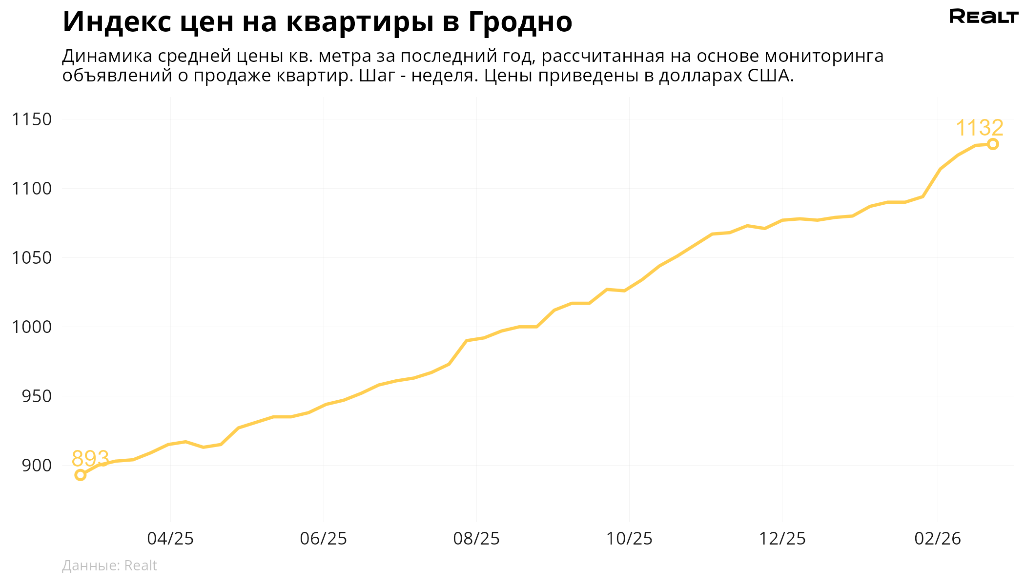 За неделю, с 16 по 23 февраля 2026 года, средняя цена в объявлениях о продаже квартир в Гродно выросла на 0.1% и составила 1132 $/м2. При этом количество квартир в продаже увеличилось на 2.6%. Что еще произошло на рынке жилья крупнейших городов Гродненской области за семь дней — в материале.