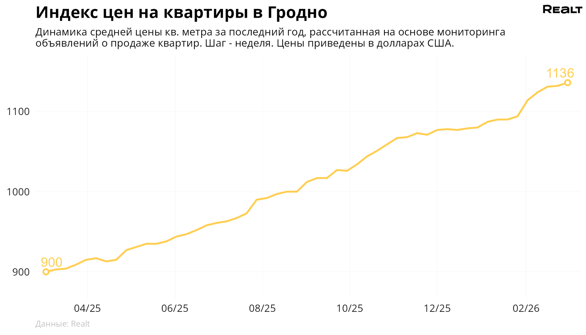 За неделю, c 23 февраля по 2 марта 2026 года, средняя цена в объявлениях о продаже квартир в Гродно выросла на 0.4% и составила 1136 $/м2. При этом количество квартир в продаже увеличилось на 3.7%. Что еще произошло на рынке жилья крупнейших городов Гродненской области за семь дней — в материале.