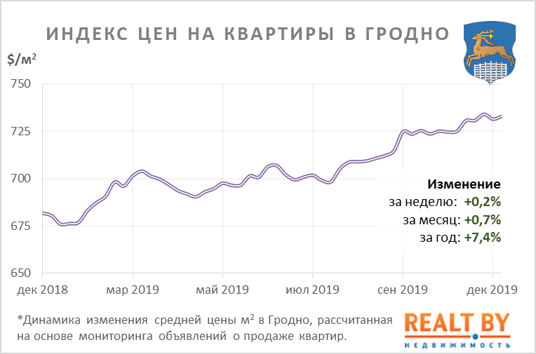 Средняя цена предложения в объявлениях о продаже квартир в Гродно на минувшей неделе выросла на 0,2% и составила 733 $/м2.