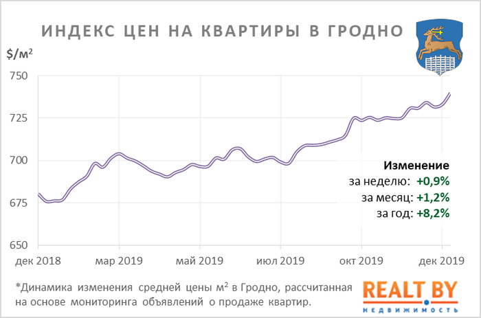 Средняя цена предложения в объявлениях о продаже квартир в Гродно на минувшей неделе выросла на 0,9% и составила 740 $/м2.