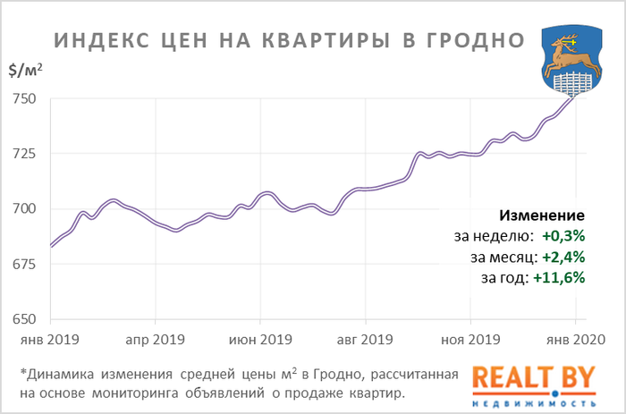 Средняя цена предложения в объявлениях о продаже квартир в Гродно на минувшей неделе выросла на 0,3% и составила 754 $/м2.