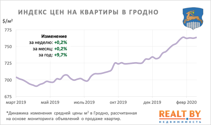 Средняя цена предложения в объявлениях о продаже квартир в Гродно на минувшей неделе выросла на 0,2% и составила 764 $/м2.