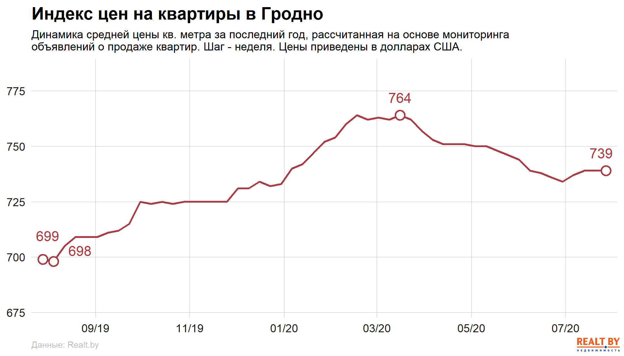 Средняя цена в объявлениях о продаже квартир в Гродно не изменилась и составила 739 $/м2.