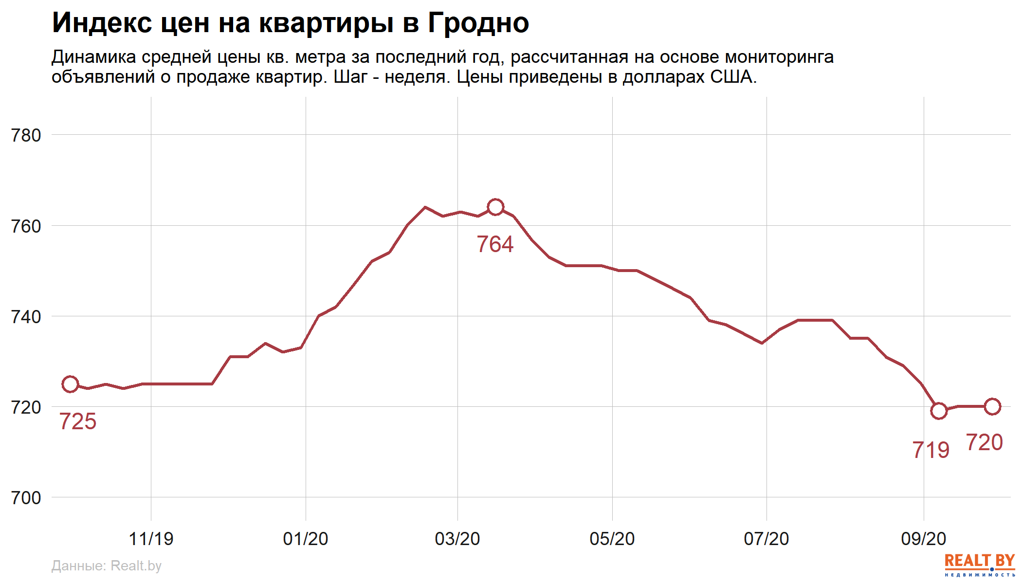 Средняя цена в объявлениях о продаже квартир в Гродно снизилась на 0.1% и составила 720 $/м2.