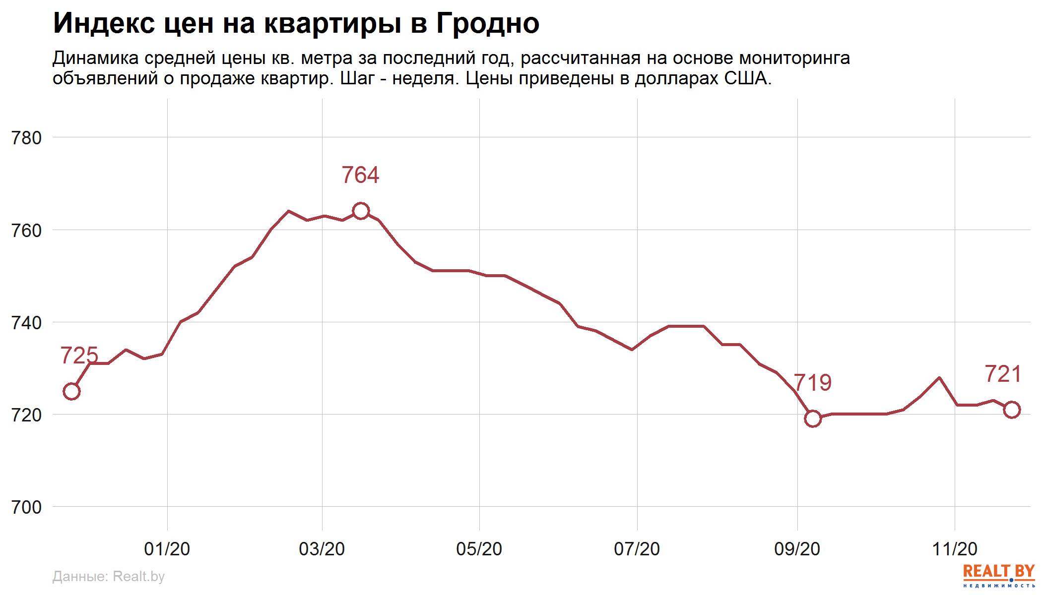 Средняя цена в объявлениях о продаже квартир в Гродно снизилась на 0.3% и составила 721 $/м2.