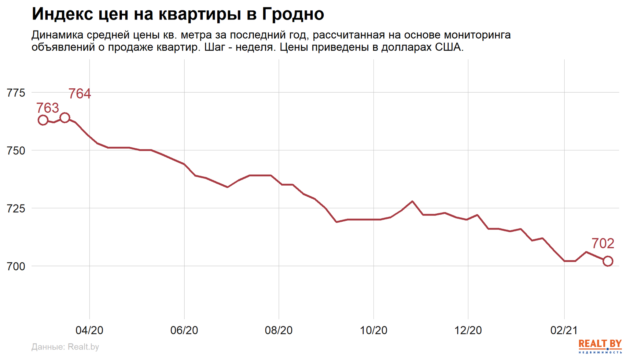 Средняя цена в объявлениях о продаже квартир в Гродно снизилась на 0.3% и составила 702 $/м2.