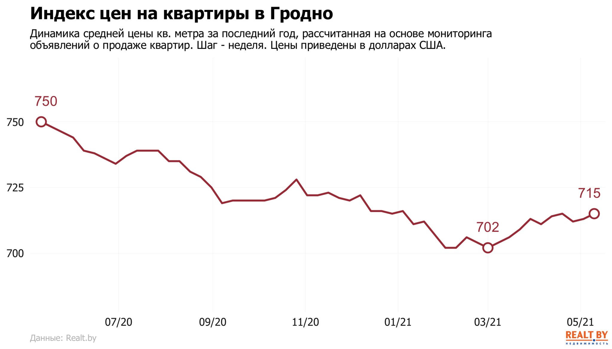 Средняя цена в объявлениях о продаже квартир в Гродно выросла на 0.3% и составила 715 $/м2.