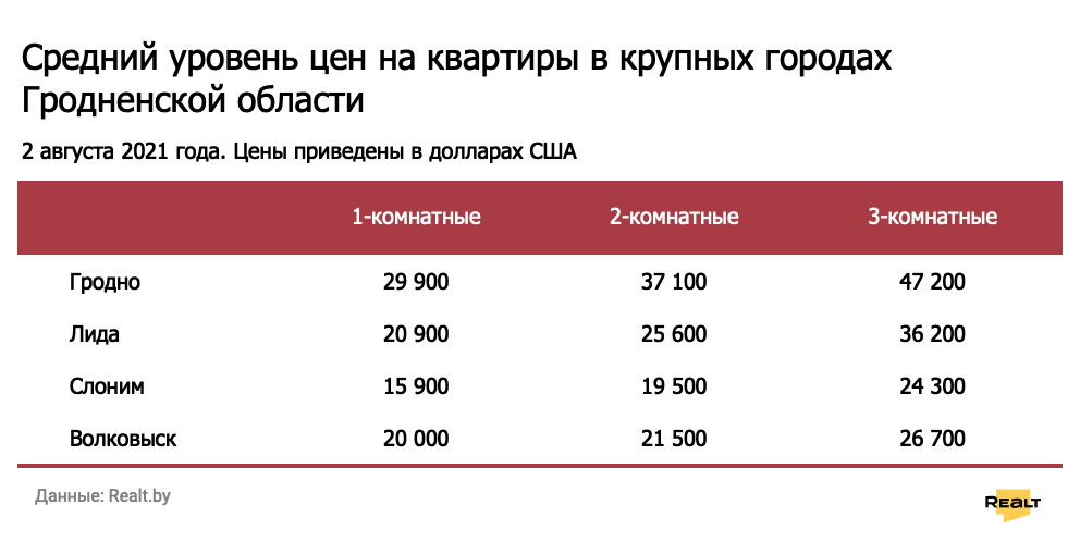 Мониторинг цен предложения квартир в Гродно и городах Гродненской области за 26 июля — 2 августа 2021 года
