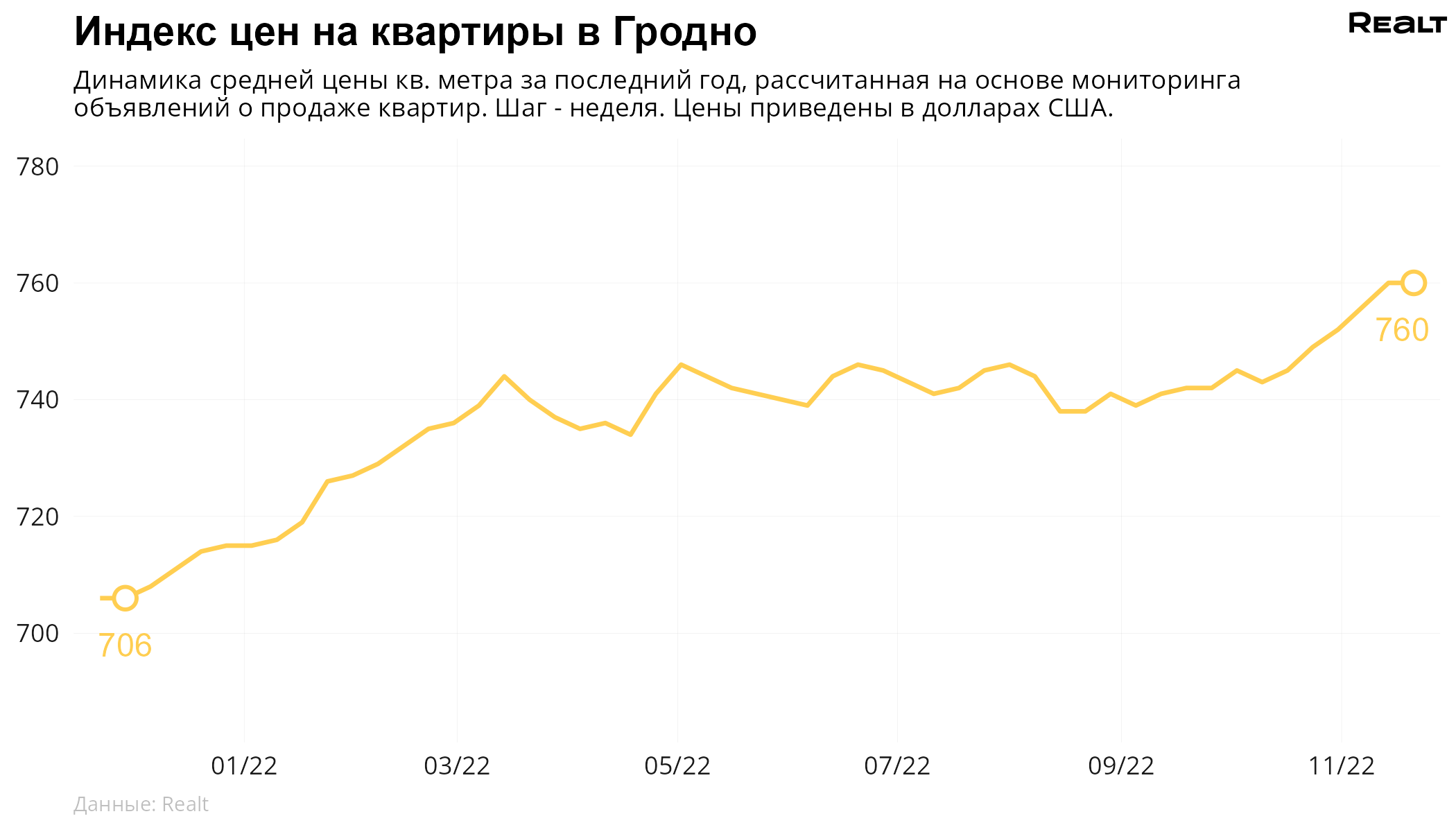 Средняя цена в объявлениях о продаже квартир в Гродно не изменилась и составила 760 $/м2.
