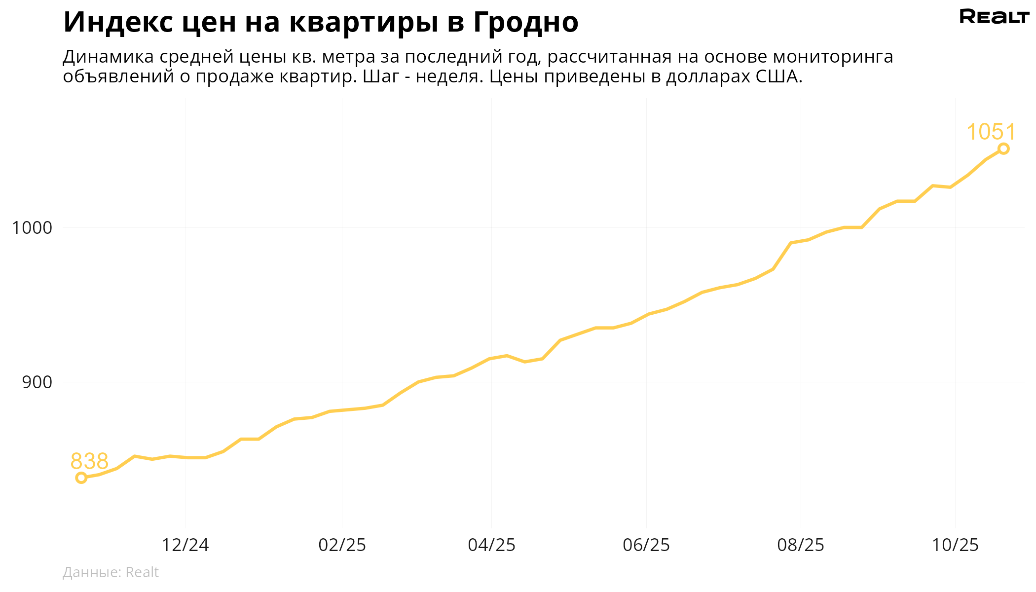 За неделю, с 13 по 20 октября 2025 года, средняя цена в объявлениях о продаже квартир в Гродно выросла на 0.7% и составила 1051 $/м2. При этом количество квартир в продаже уменьшилось на 5.8%. Что еще произошло на рынке жилья крупнейших городов Гродненской области за семь дней — в материале.