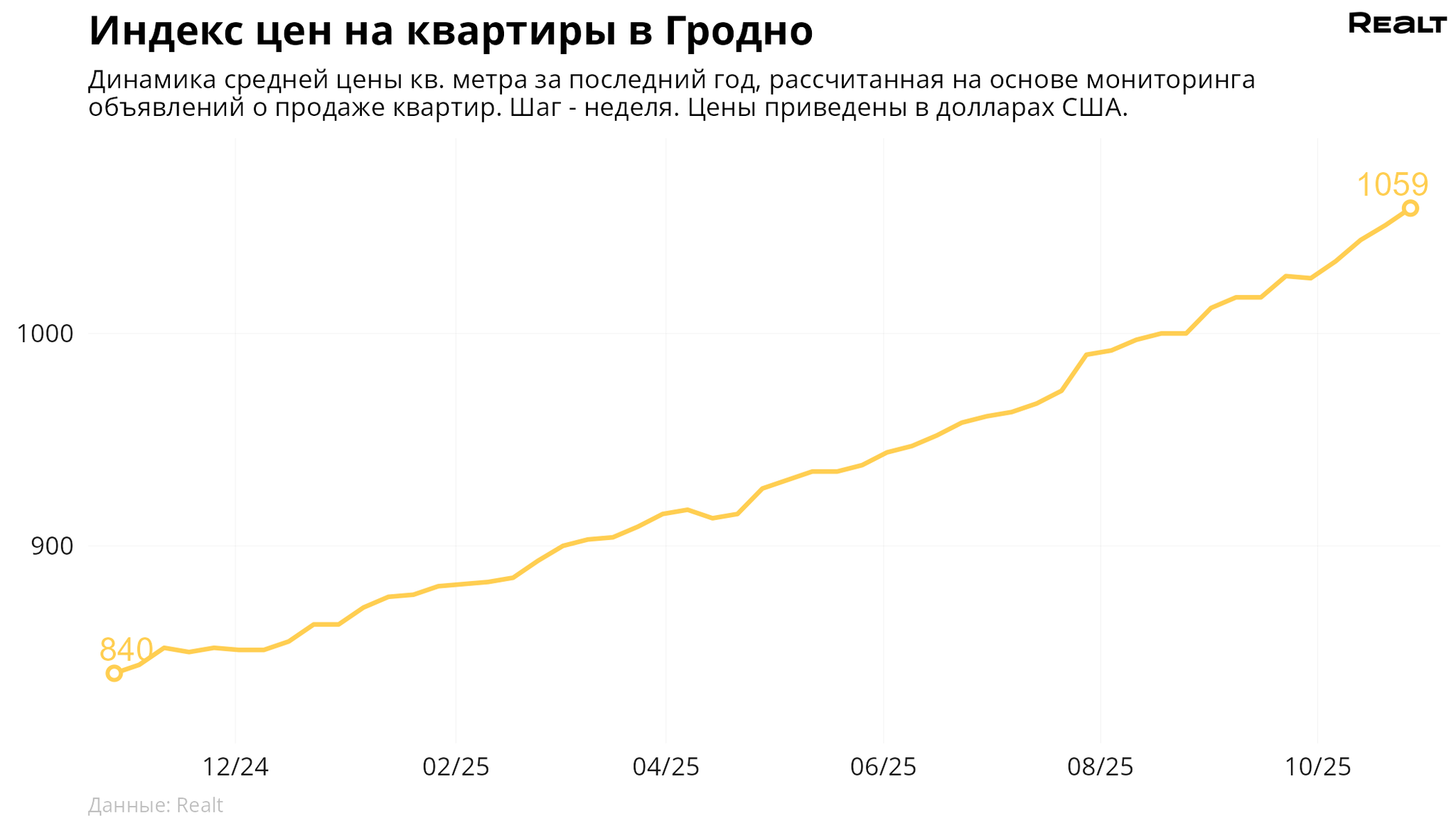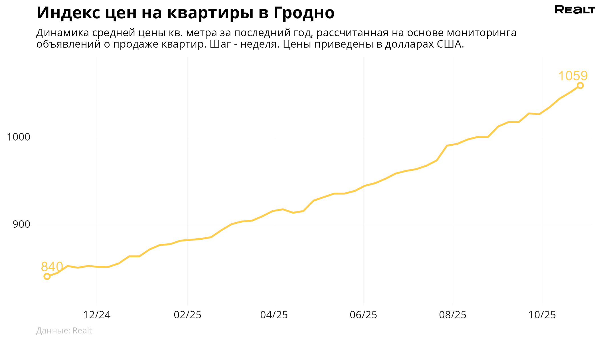 За неделю, с 20 по 27 октября 2025 года, средняя цена в объявлениях о продаже квартир в Гродно выросла на 0.8% и составила 1059 $/м2. При этом количество квартир в продаже увеличилось на 2.6%. Что еще произошло на рынке жилья крупнейших городов Гродненской области за семь дней — в материале.