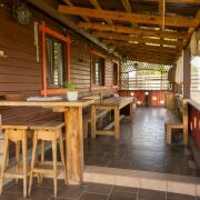 На территории находится несколько помещений для комфортного отдыха и времяпровождения. В аренду сдаётся основной дом с 4-я жилыми комнатами, баней, бассейном, просторной кухней оснащенной всеми удобствами (вся необходимая посуда, посудомойка, холодная и горячая вода, плита, духовка, холодильник и прочее), летняя терраса, шашлычная, детская площадка, сцена и многое другое. Дом вмещает себя до 12 гостей, спальных мест 5+, есть возможность сделать больше.