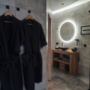 Финская сауна на дровах находится непосредственно в доме в банном блоке, из которого есть отдельный выход на террасу и к сибирскому чану на дровах(оплачиваются отдельно).