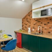 Эта новая стильная студия расположена в самом центре Гродно, в шаговой доступности от всех достопримечательностей. Неподалеку находятся два вокзала, что очень удобно для гостей, путешествующих общественным транспортом. Из окон открывается завораживающий вид на историческую застройку города. Апартаменты оснащены всем необходимым для комфортного проживания 2 гостей: двуспальная кровать, современная кухня, бытовая техника, уютная обеденная зона, душевая кабина. Яркие и сочные цвета, использованные в отделке апартаментов, будут радовать Ваш глаз во время проживания и создавать ощущение маленького праздника!