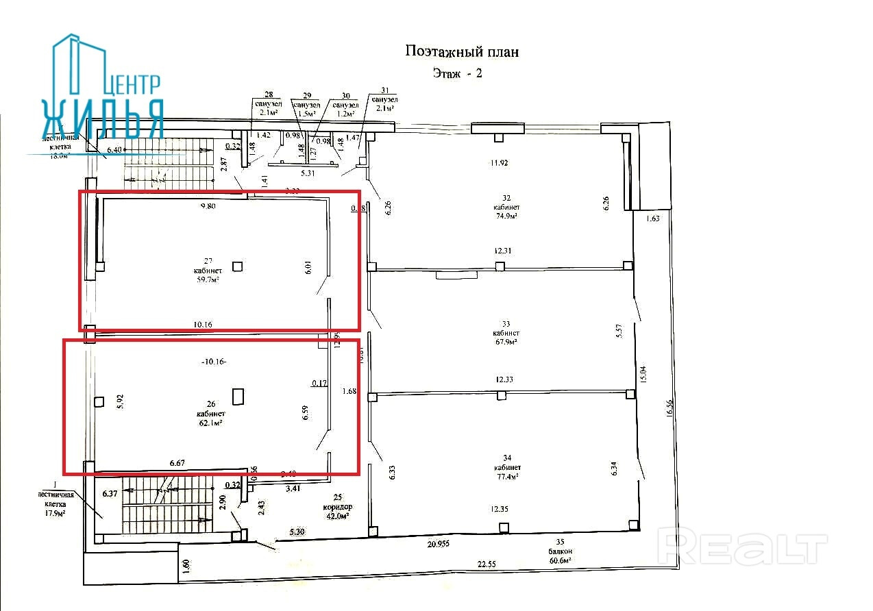 Площадь помещений – 59,7 и 62,1 м2.