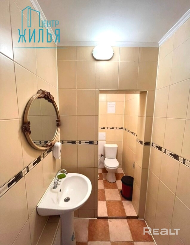 Офисная отделка, санузел на коридоре. Большая парковка у здания.