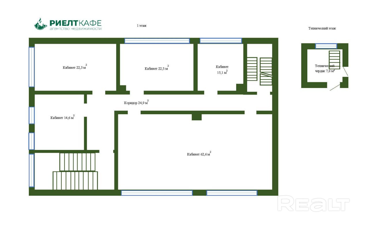 Второй этаж: 5 кабинетов: 62,6 м2; 14,6 м2; 22,3 м2; 22,5 м2; 15,1 м2.