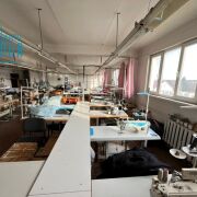 Организовано 10 рабочих мест с оборудованием и освещением над каждым местом (возможно увеличение до 15ти), есть раскройный стол, 2 места для глажки продукции.