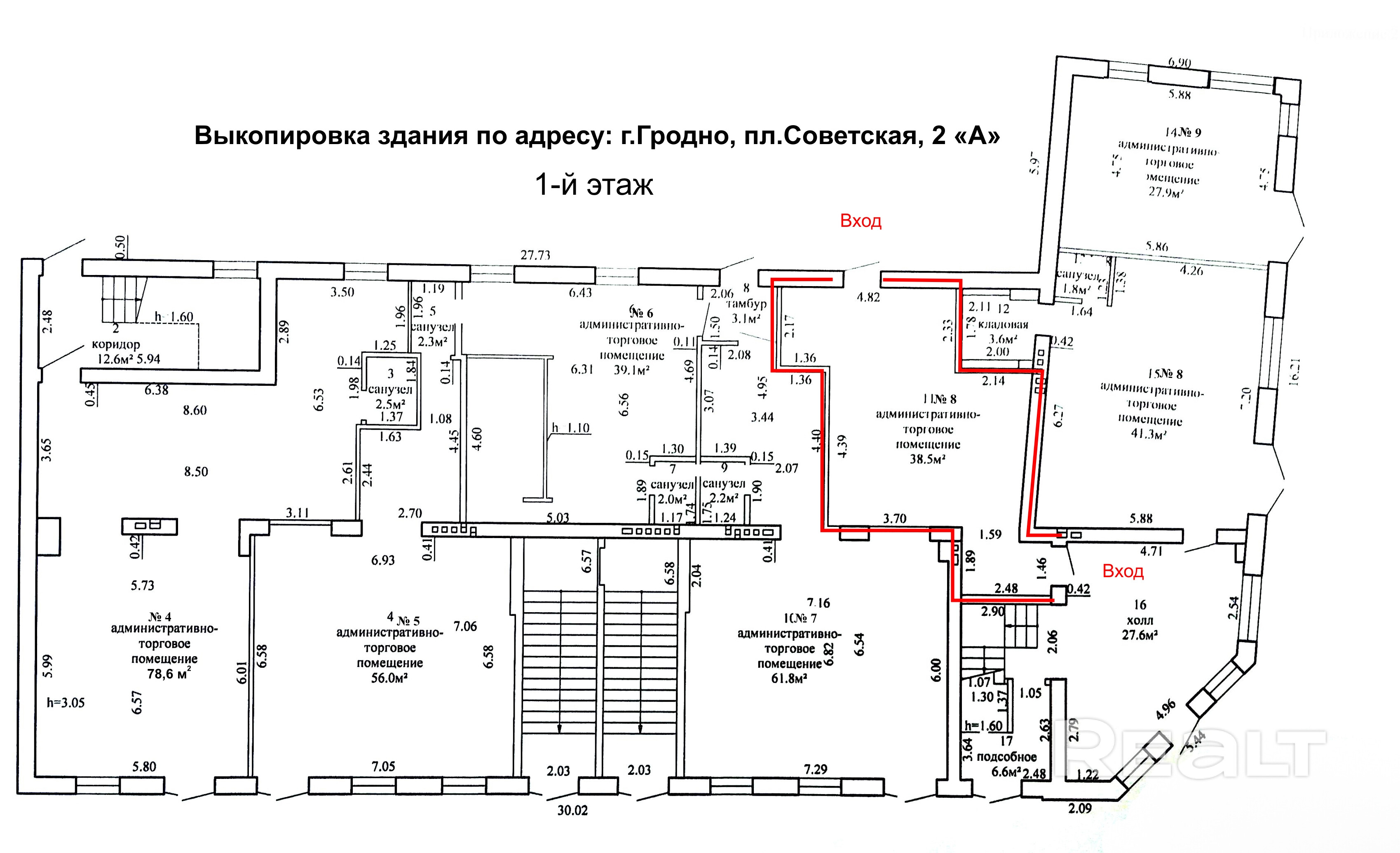 Сдается в аренду помещение 38,5 кв.м. на первом этаже с двумя входами с возможностью использования под общепит, торговлю, офис или услуги. Здание расположено в центре Гродно (площадь Советская). В помещении есть холодная и горячая вода, канализация, установлен кондиционер. Вдоль здания проходит большой пешеходный и автомобильный трафик.