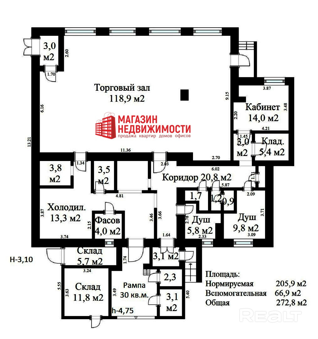 В него входит: Торговый зал- 118,9 кв.м., кабинет- 14,0 кв.м., четыре кладовые- 1,57; 1,7; 3,0; 3,8; 5,4 кв.м., два склада- 5,7; 11,8 кв.м., холодильные помещения- 13,3 кв.м., моечная- 3,5 кв.м., фасовочная- 4,0 кв.м., рампа- 30 кв.м., две душевые- 5,8; 9,8 кв.м., два санузла- 0,9; 1,2 кв.м., помещение для хранения мусора- 3,1; кв.м., коридор- 3,0; 10,3; 10,5 кв.м., узел учёта электроэнергии- 0,9 кв.м. тамбур- 3,0; 3,1 кв.м.